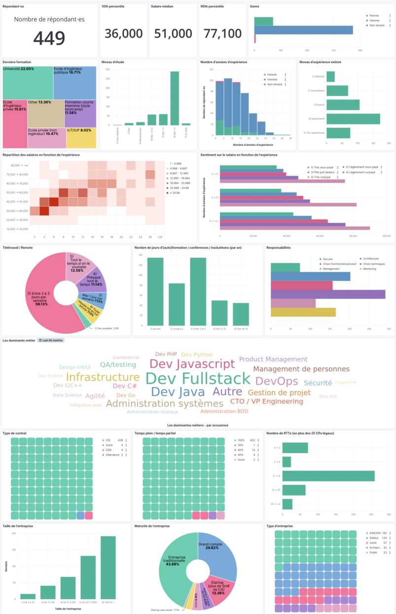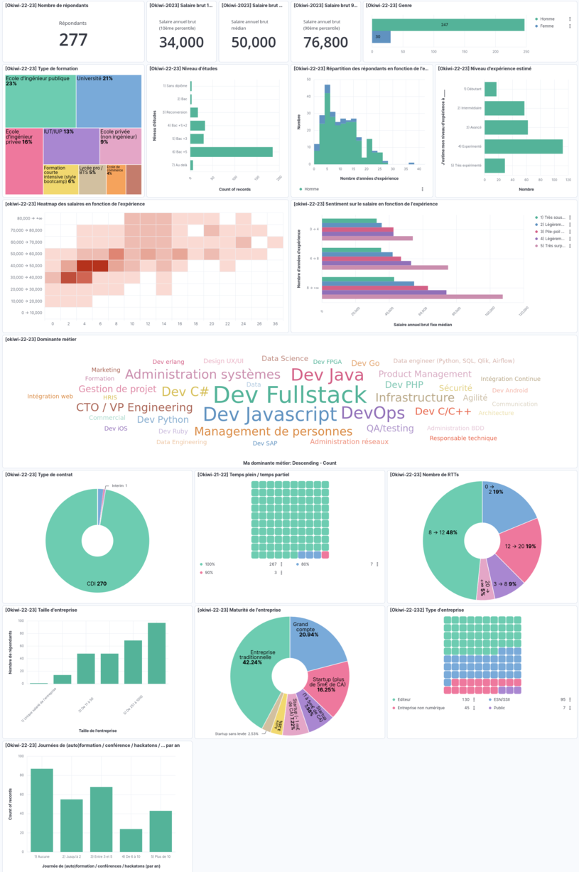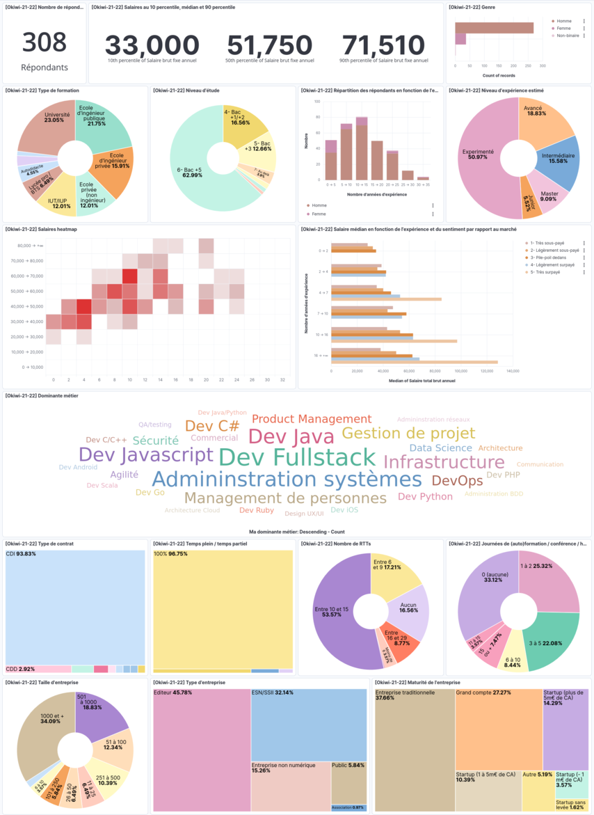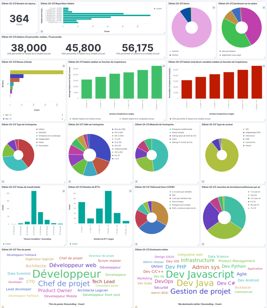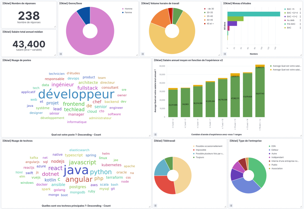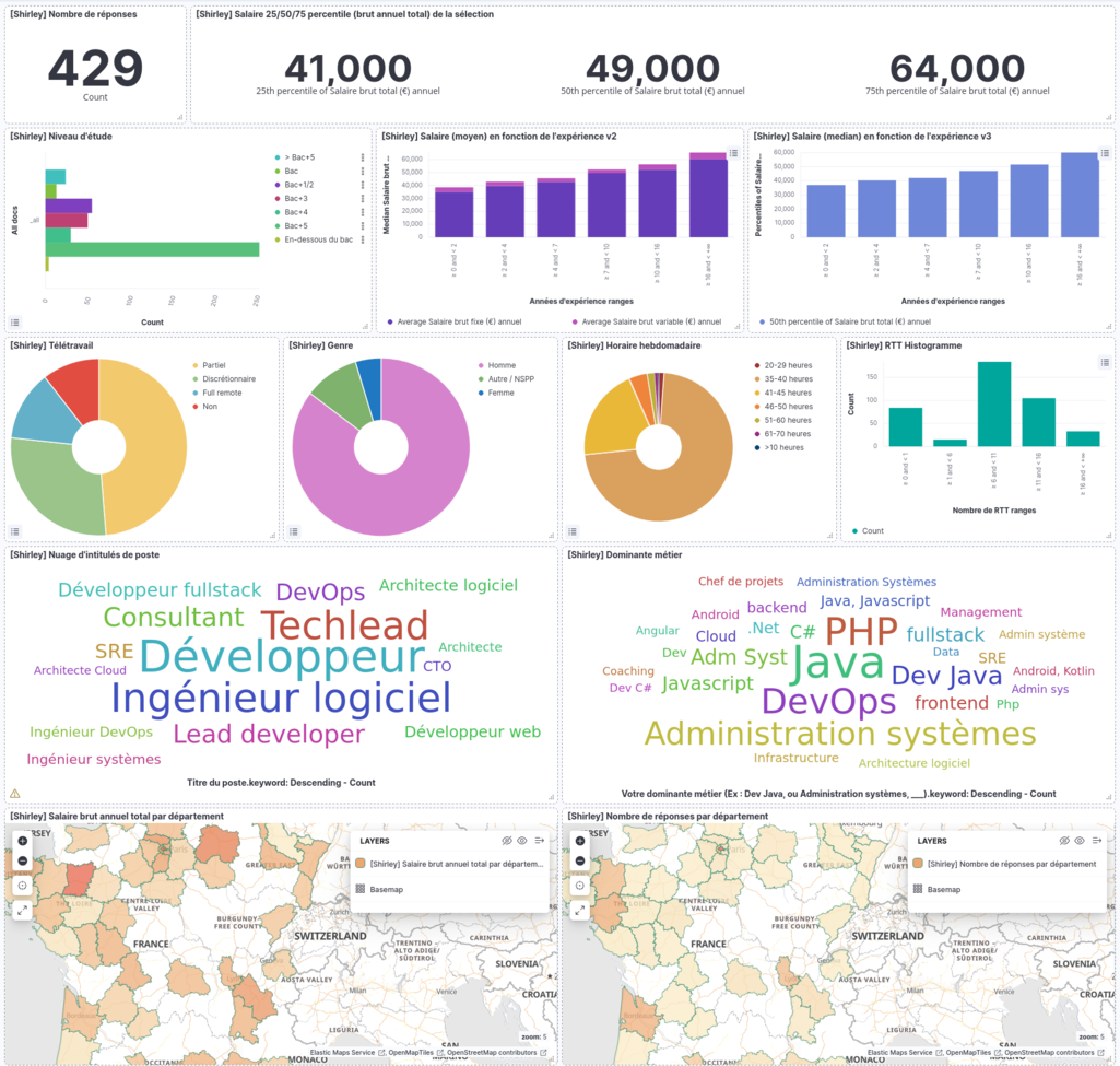 En 2020, Shirley Almosni Chiche (agent de carrière IT) avait lancé de son côté une étude sur les salaires de l’IT à l’échelle nationale. Elle avait récolté pas mal de réponses (plus de 400) et comme j’avais déjà l’infrastructure Kibana qui tournait pour Okiwi, je lui ai proposé d’héberger ses données sur mon serveur pour que ce soit plus ludique d’explorer les résultats qu’un simple Google Sheet.