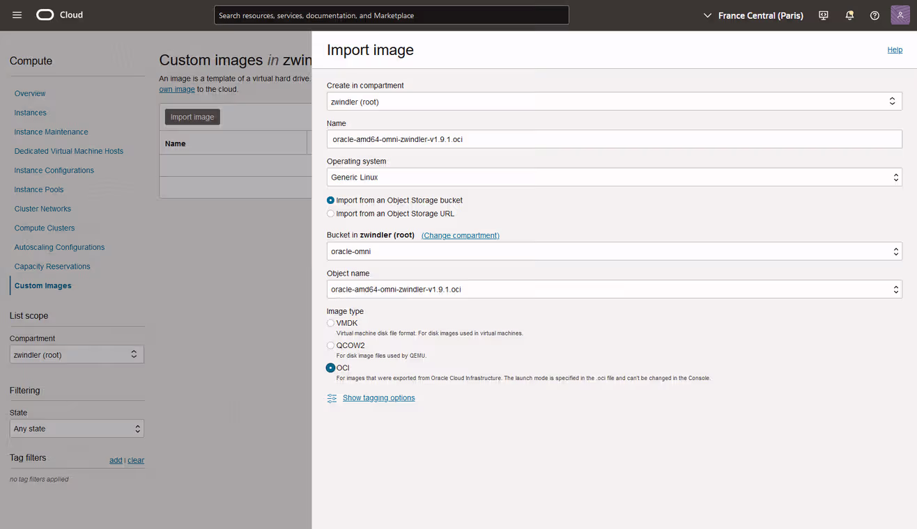 - Upload the image (oracle-amd64-omni-zwindler-v1.9.1.oci) to this bucket.