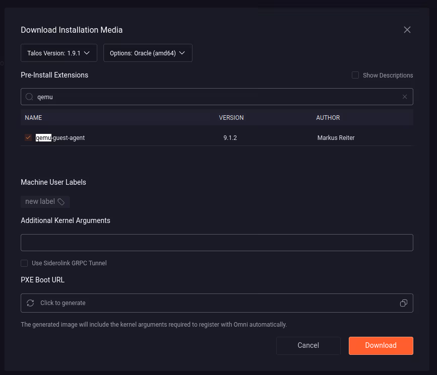 So we connect to our Omni interface and download the appropriate Talos Linux image: