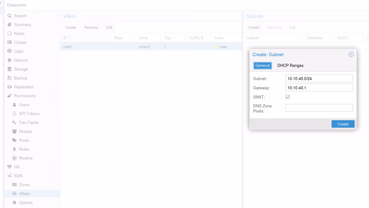 Once you’ve validated, go to the SDN/VNets submenu, click the “Create” button to create a virtual network, then select it once created to create a subnet.